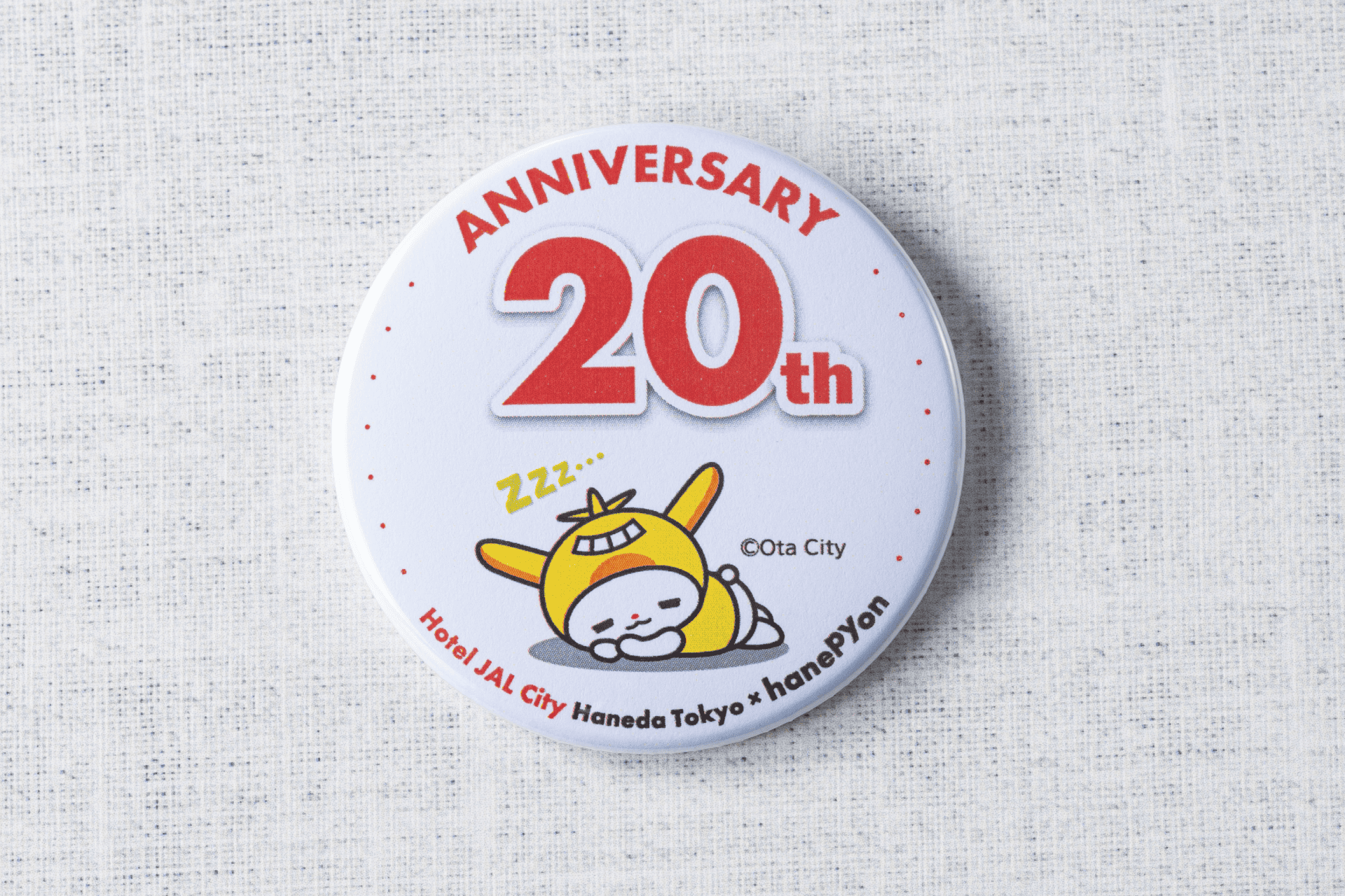 大田区公式PRキャラクター「はねぴょん」とのコラボレーション宿泊プランを販売いたします。プラン内容のコラボ缶バッジは20周年を祝うデザインに加え、光の角度によって輝きが変わるホログラム加工を施した特別仕様です。ここでしか手に入らない、記念の缶バッジをぜひお持ち帰りください。